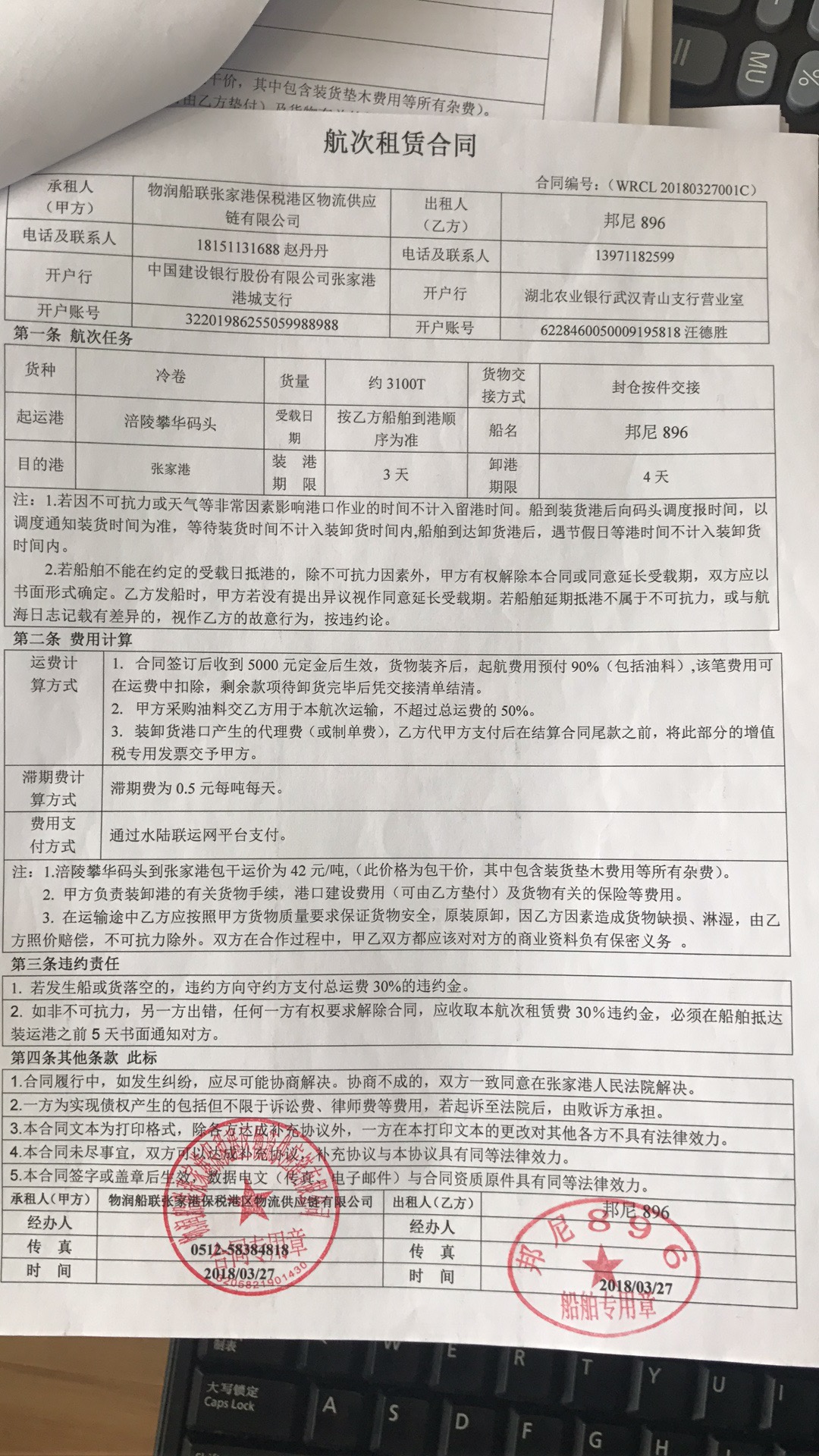 - 结算方式起航0%,抵港0%,回单100%